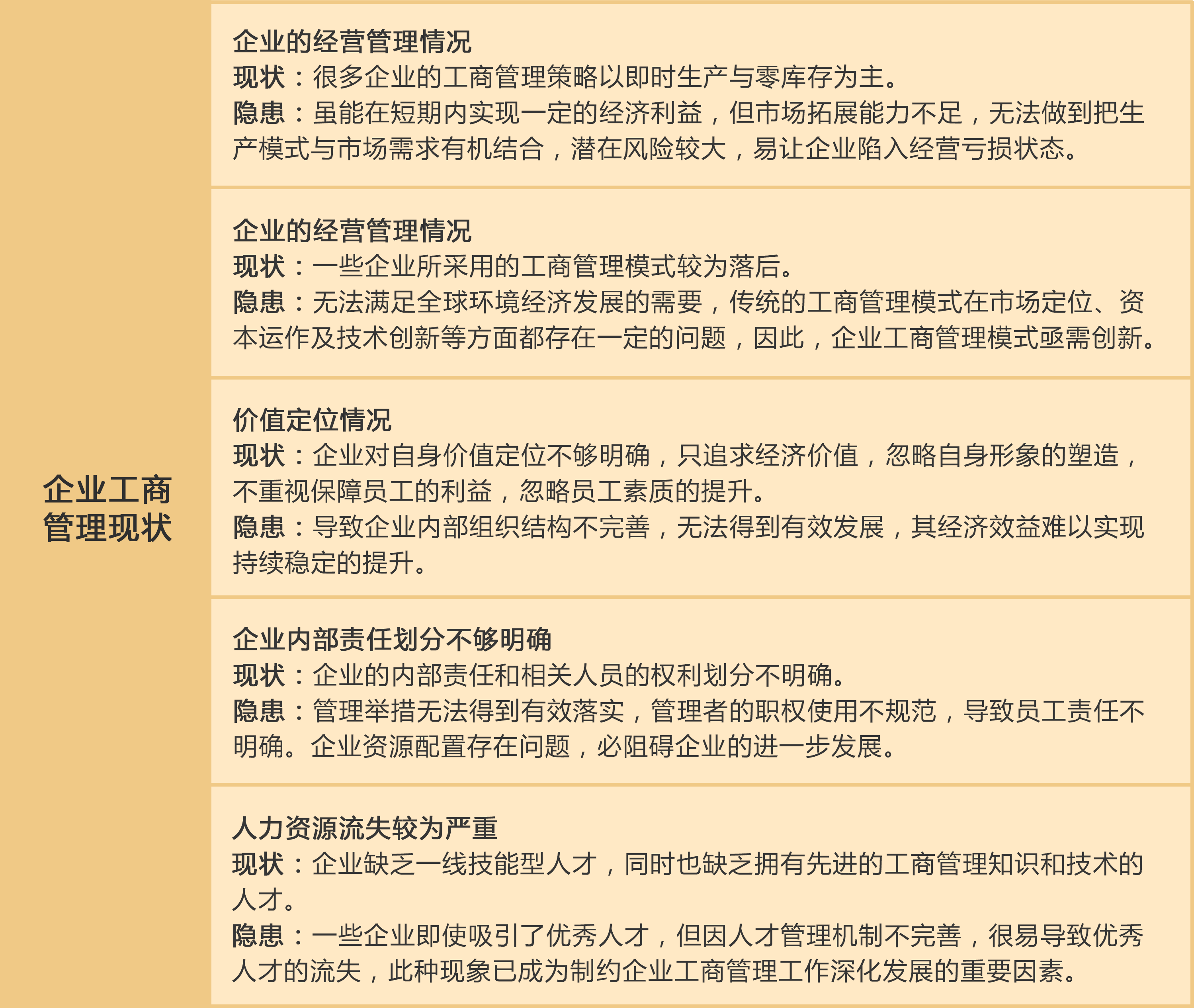 工商管理为企业战略决策提供支持,保障企业持久健康发展。工商管理主要包括对企业日常工作、财务状况、人力资源状况、市场营销等方面的管理,另外还包括,对企业文化背景的创设管理,对企业良好形象的塑造与保护等精神文明建设方面的管理。